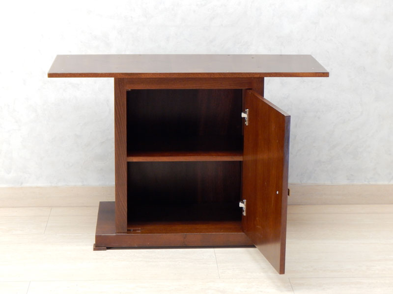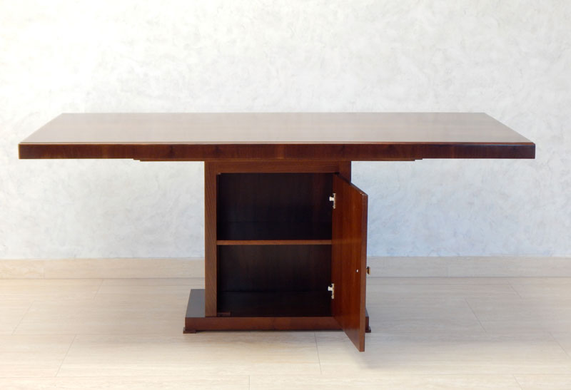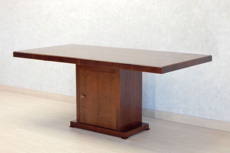 Diófa, mahagóni vagy paliszander borítással, az asztal talapzata edénytároló, 1 db ajtóval és 1 db polccal. Mérete miatt a helyszínen szereljük össze. Mérete: 180 x 90 cm, magassága: 77 cm.