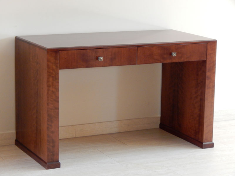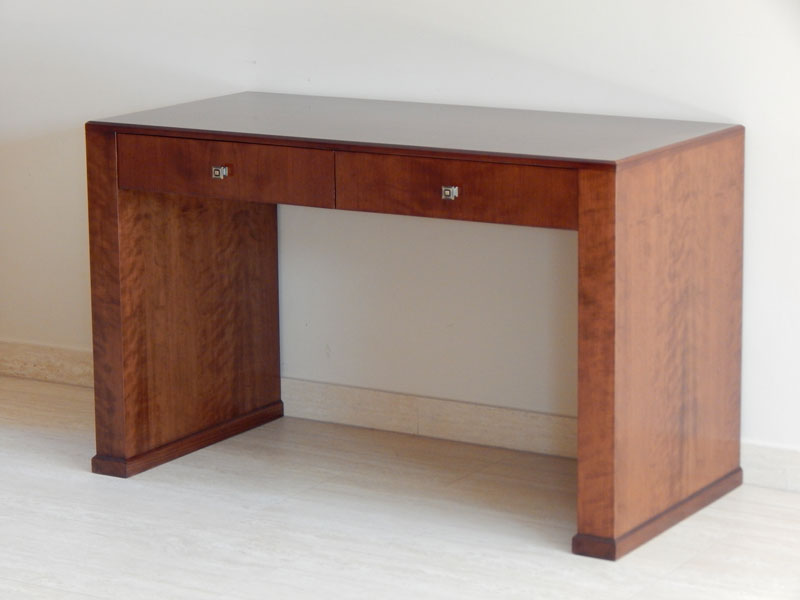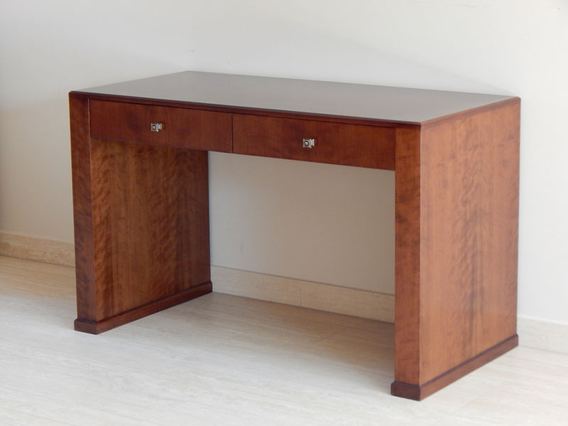 Art Deco férfi íróasztal [A-20] Art Deco férfi íróasztal [A-20] A méret ár: 345 000 Ft B méret ár: 395 000 Ft Diófa vagy mahagóni borítással, hasáb alakú lábakkal, 2 db fiókkal.(A) méret: 120 x 70 cm, magassága: 77 cm,(B) méret: 140 x 70 cm, magassága: 77 cmA méret és formaváltozás 10 – 30 % felárat jelent Vissza