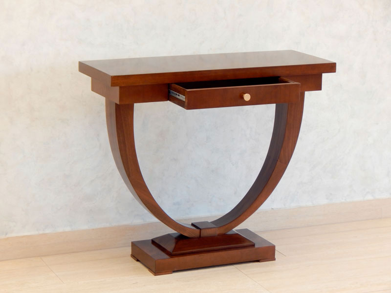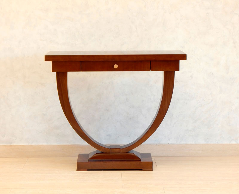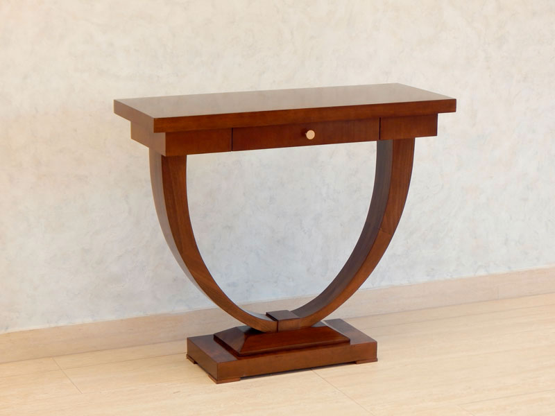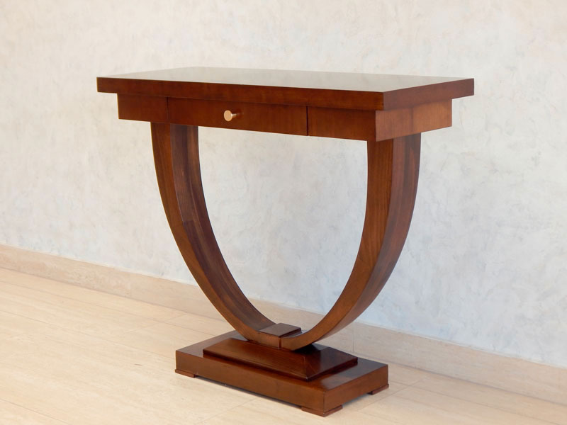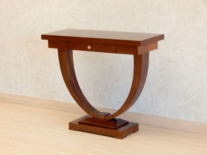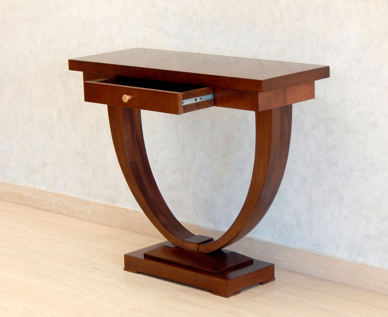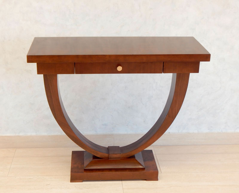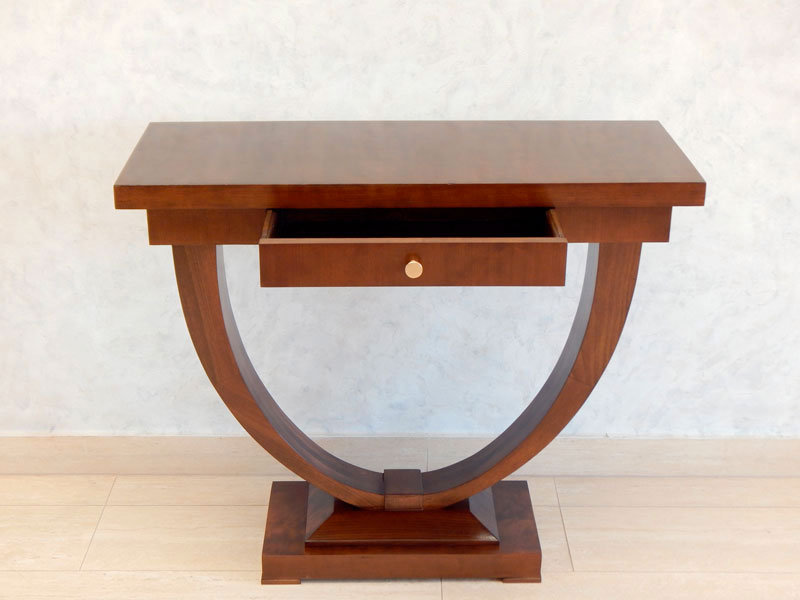 Art Deco konzolasztal fiókos [B-20] Art Deco konzolasztal fiókos [B-20] Ára: 265 000 Ft Diófa, mahagóni vagy paliszander borítással, diófa hajlított lábakkal, 1 db fiókkal.Méret: 90 x 35 cm magassága: 77 cm.Méret és formaváltozás, 10 – 30 % felárat jelent! Vissza