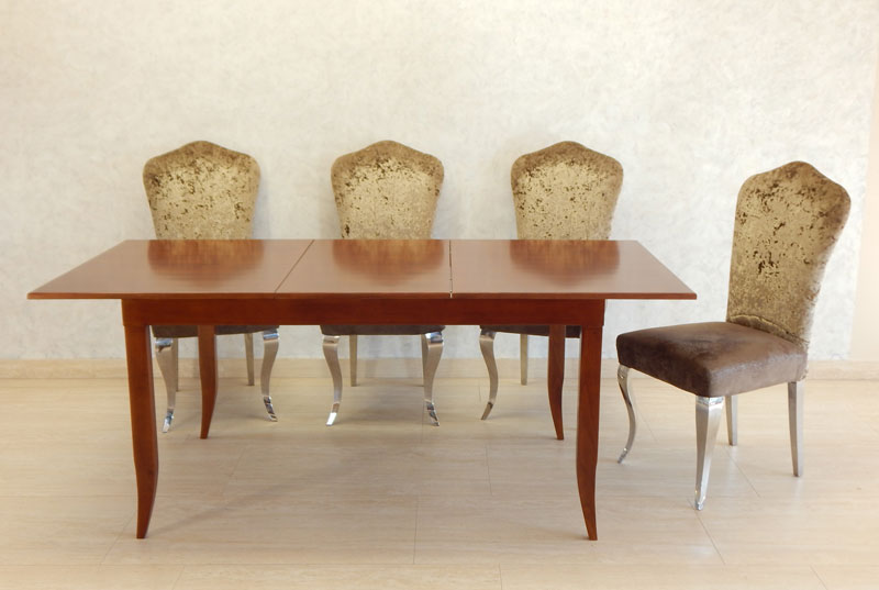 Dió ,cseresznye vagy paliszander borítással, diófa íves lábakkal. Bővíthető vendéglappal.